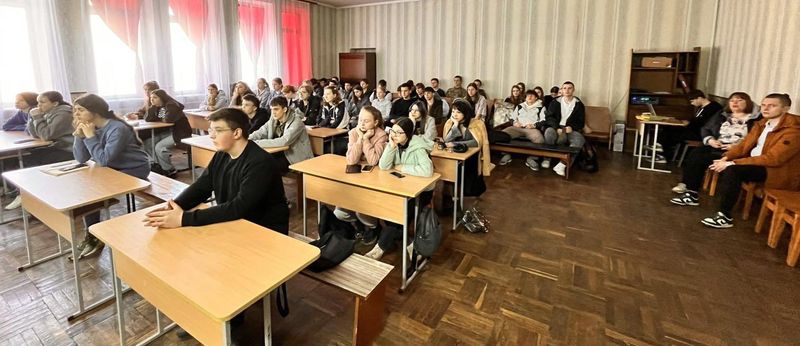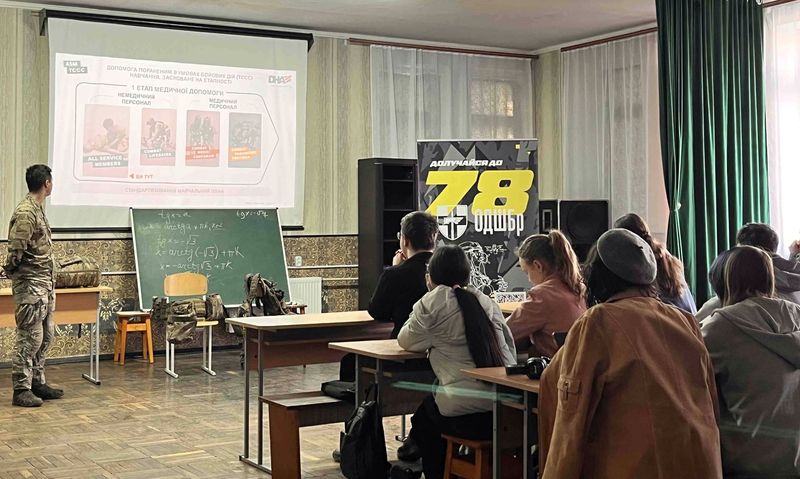 На фото видно, з якою увагою студенти стежать за презентацією та інструкціями військових.